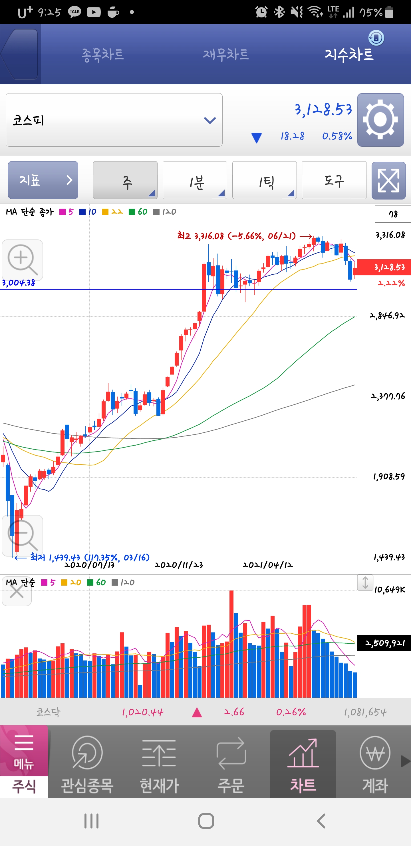 오늘도 코스피 3120을 지지하며 3128에 마감하였다. 주봉상보면 내일 급등해서 지난주 음봉을 다 잡아먹으면