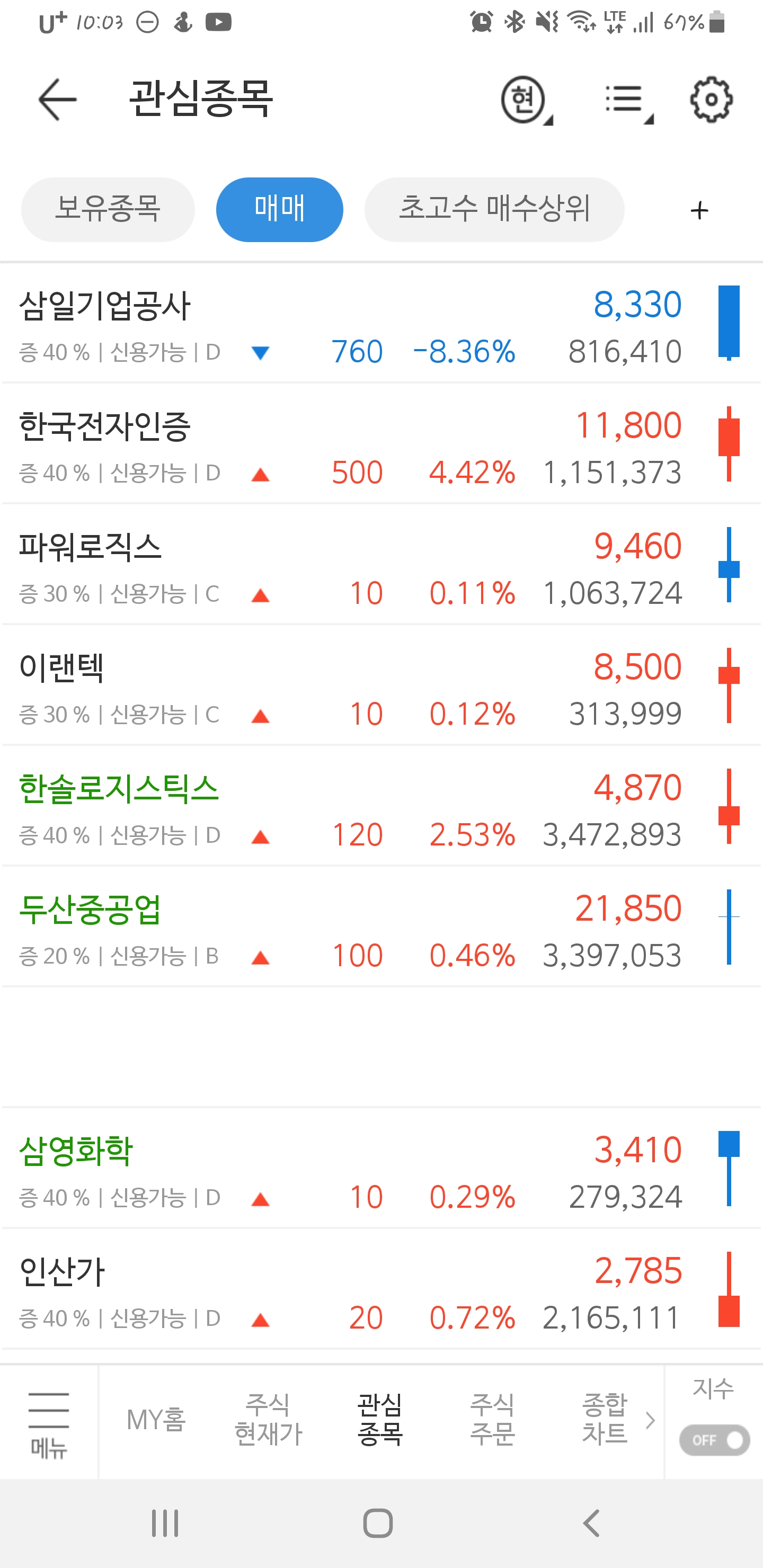 카카오뱅크를 대응하는 동안 카스가 10%에서 시작을 했을 때 내심 상한가를 기대하며 신경쓰지 않았는데, 역시나 개인의 욕심과는 반대로 움직였다. 이재명이 54.5%이상 지지로 어느순간 욕심이 자리를 잡았다. 수익률 다까먹고 5%선에서 다 정리를 하다보니 조급하게 다음종목을 찾게되었다. 하지만 어제 선정했던 종목들이 생각외로 움직이지 않았다. 원래는 밑꼬리 달고 반등하는 종목을 눈여겨 보는데 오늘은 급락한 삼일기업공사를 매수하게 되었다.