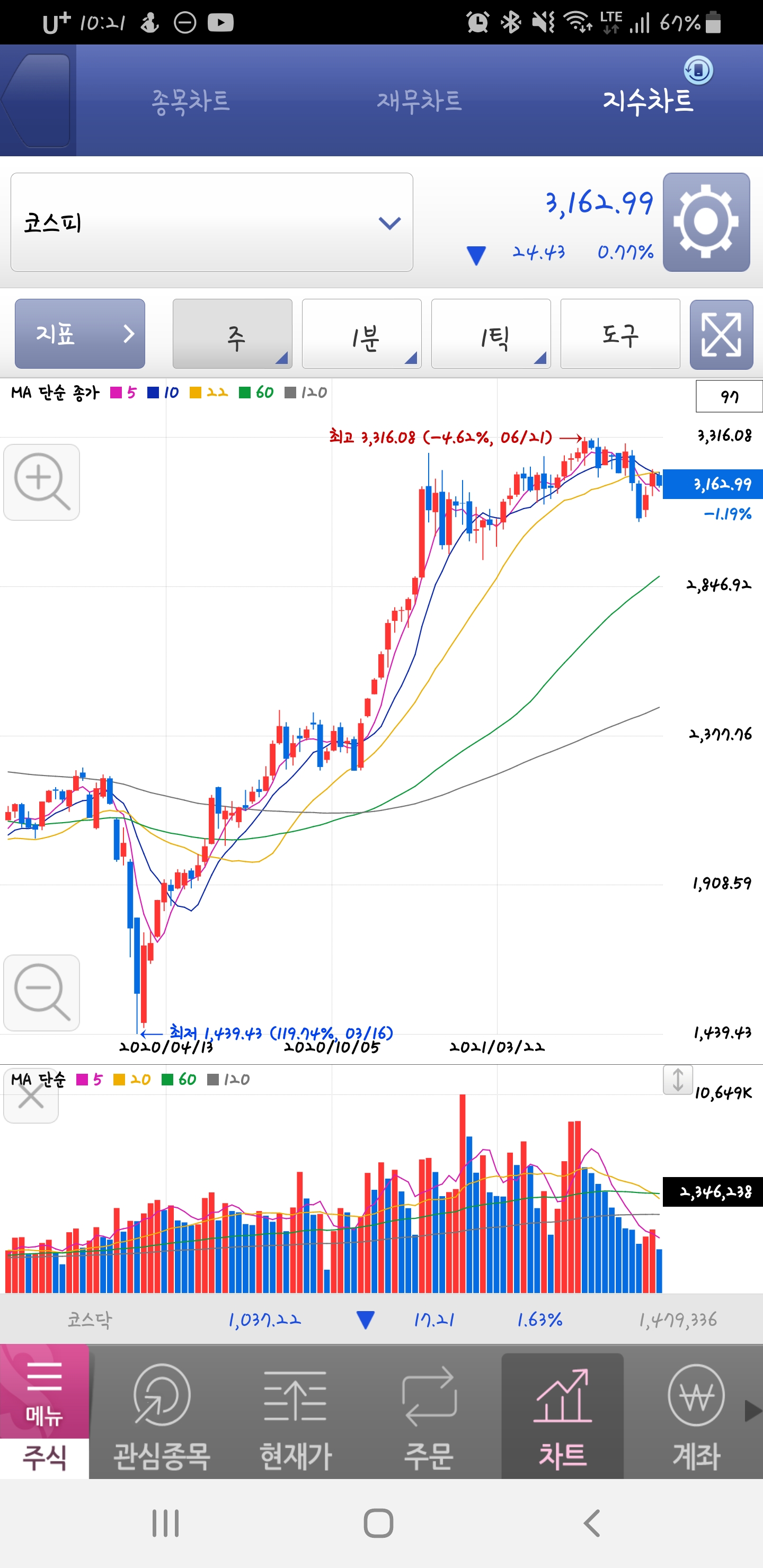 단지 코스피가 2일 연속 하락했지만 주봉으로보면 그렇게 많이 빠지지 않는 그림이다.
